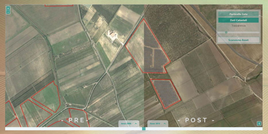 Con Scansiona Asset è possibile effettuare il confronto dello stato delle proprietà dell'Ente tra due periodi differenti, in tempi rapidi: settando i periodi di interesse, è sufficiente far scorrere lo slider da un lato all'altro per rilevare le variazioni delle coperture del suolo. Il sistema mostrerà le differenze evidenziando i limiti delle particelle che hanno subito variazioni, in toto o parzialmente.